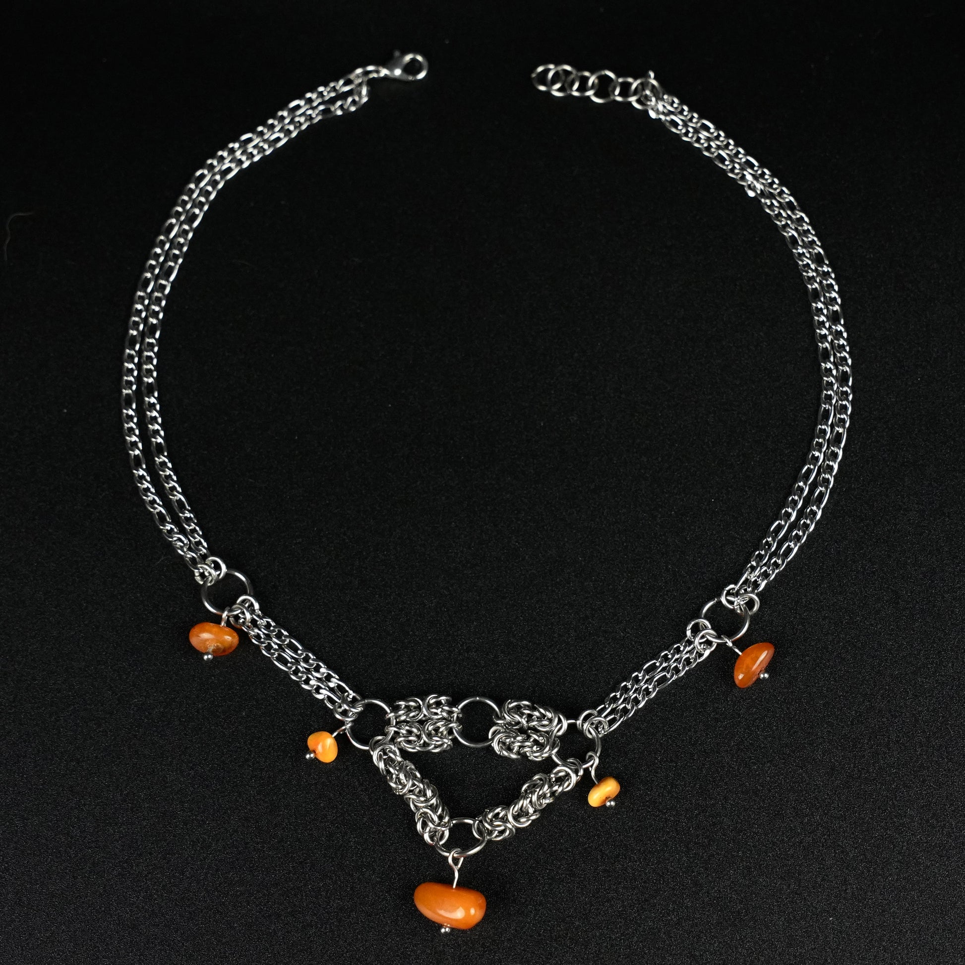 Handwoven from stainless steel rings and chain, this necklace is adorned with vintage amber-toned beads taken from my grandmother’s old necklace. Transforming cherished pieces into wearable art.