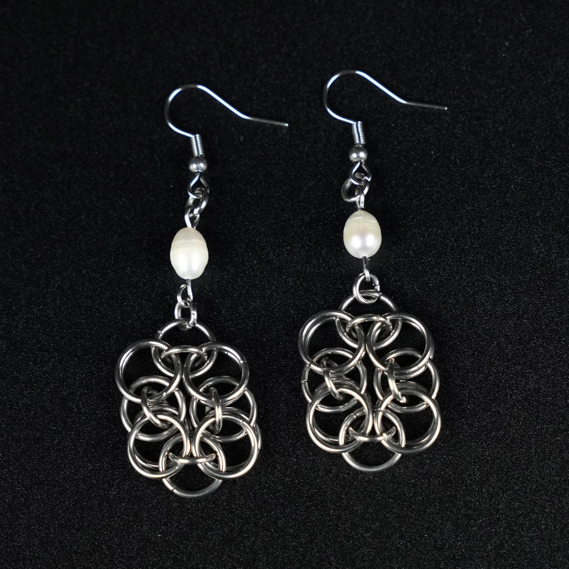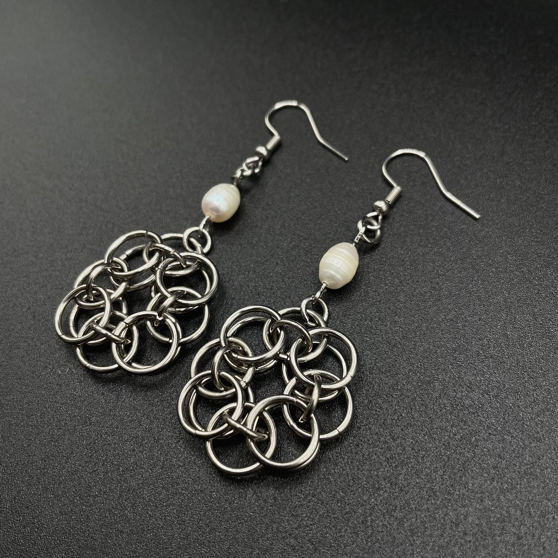 Delicate chainmail earrings adorned with a natural pearl.