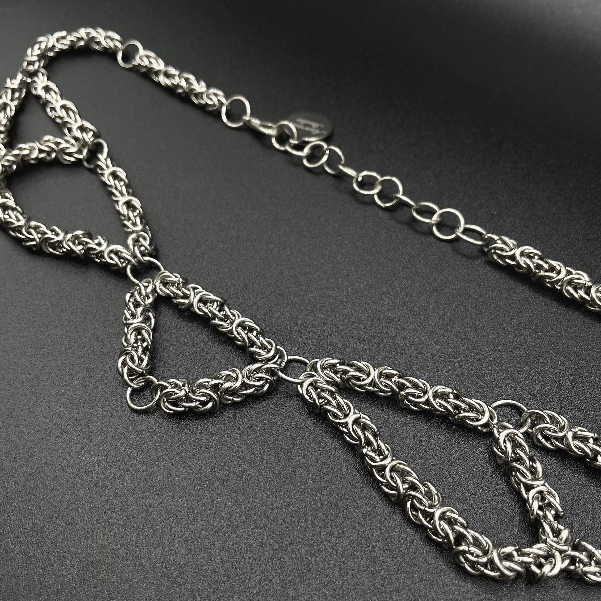 Over 600 stainless steel rings each individually opened and closed by hand. Linked in a Byzantine weave.