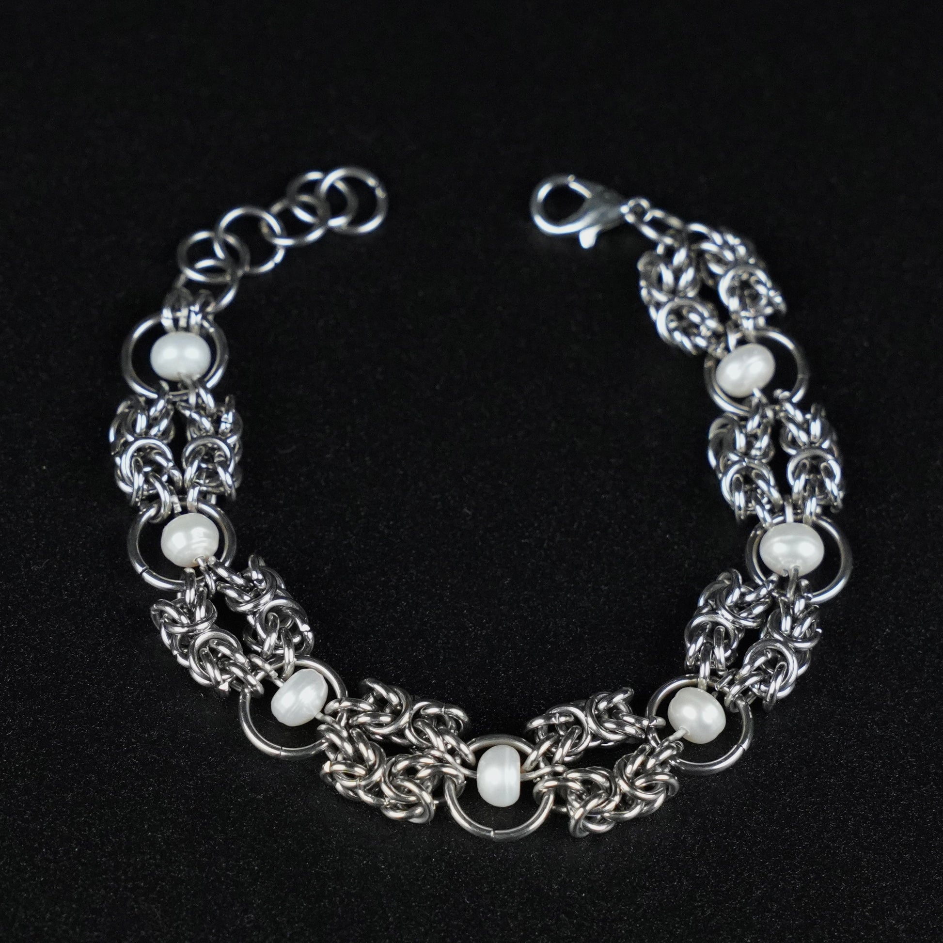 A delicate handwoven bracelet adorned with freshwater pearls.